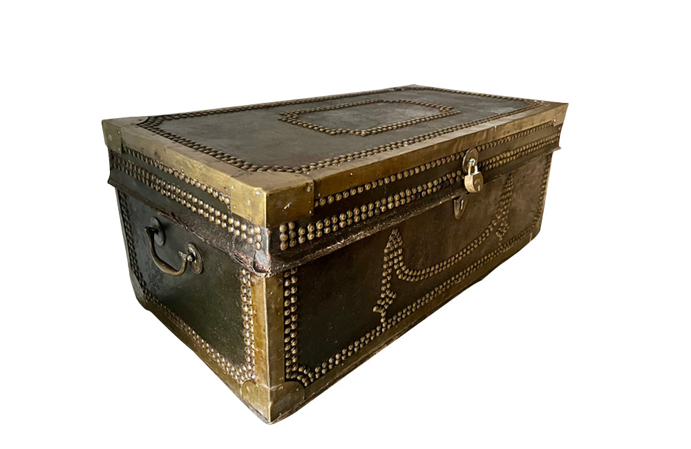 An early 19th century brass banded and studded leather trunk. Lock and key. It has a charming little brass Watan padlock serving as the lid handle.