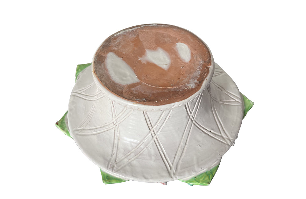 20th century glazed terracotta centrepiece in the form of a basket with seven open mouthed frogs on flowering water lily pads surrounding the rim.