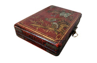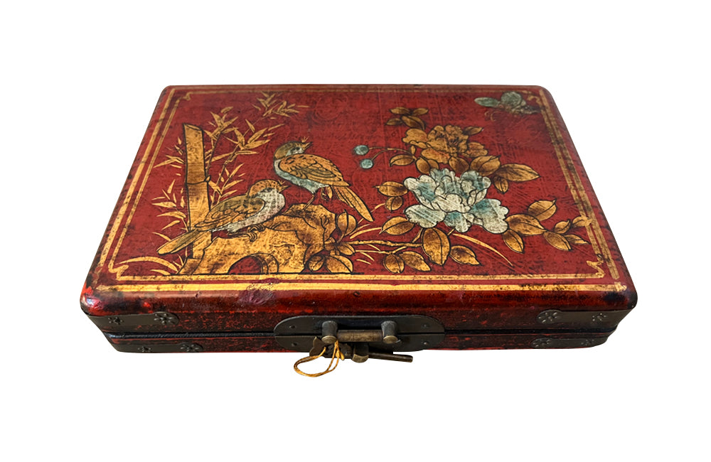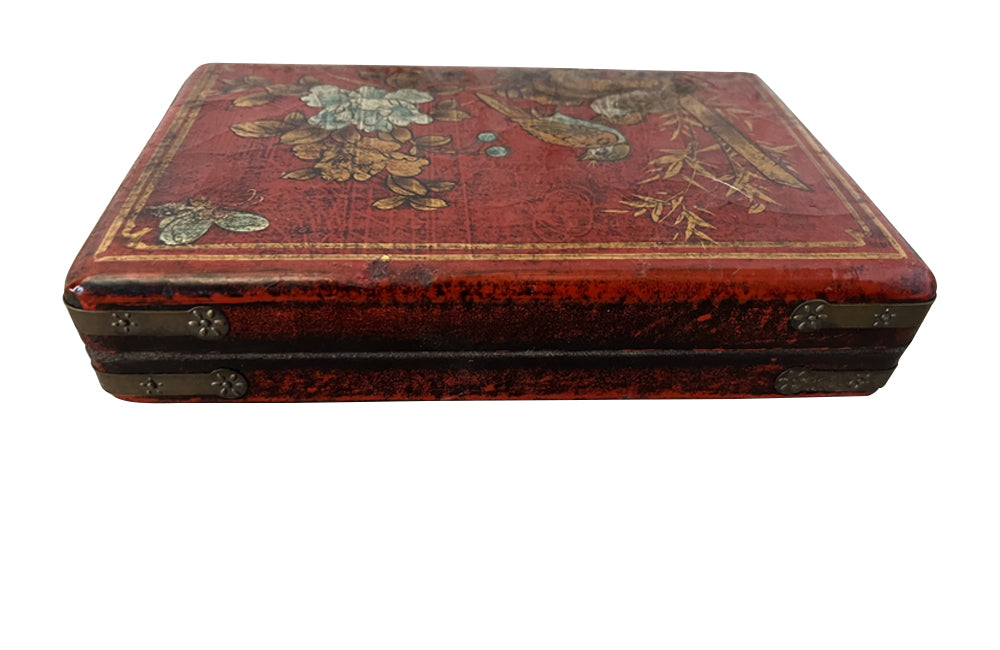 20th Century Chinese lacquered faux leather box with bronze clad hinges and front latch.The pretty exterior decoration depicts birds with bamboo and flowers.