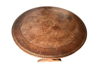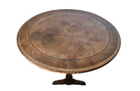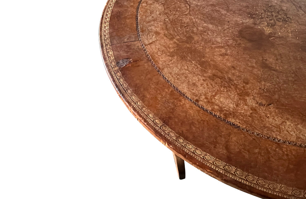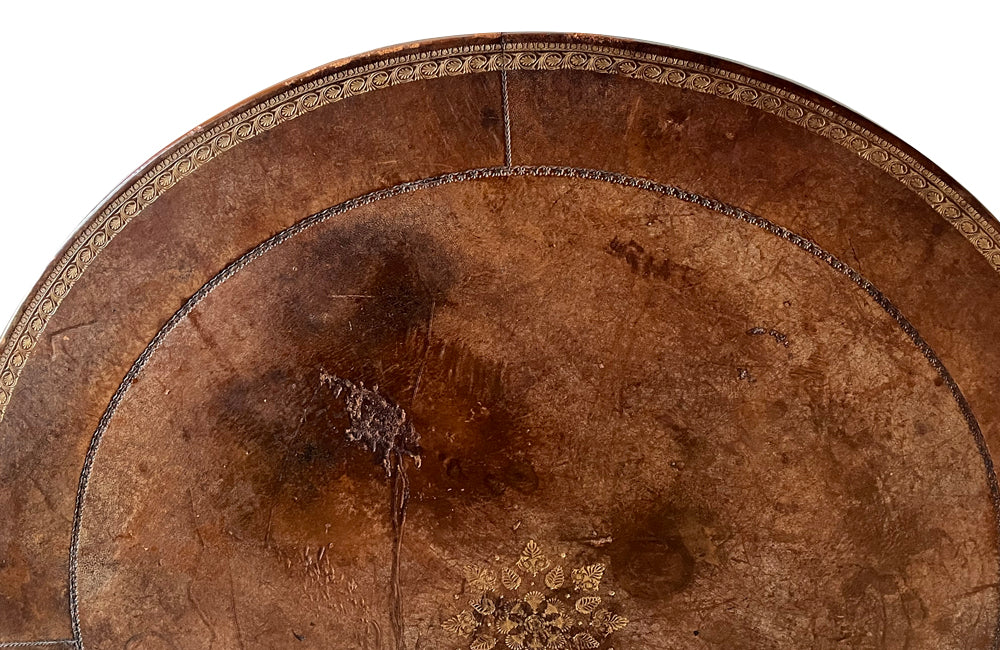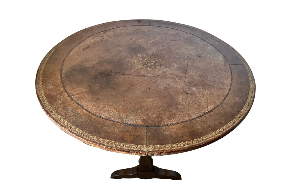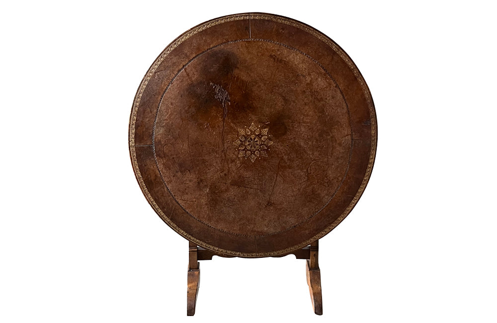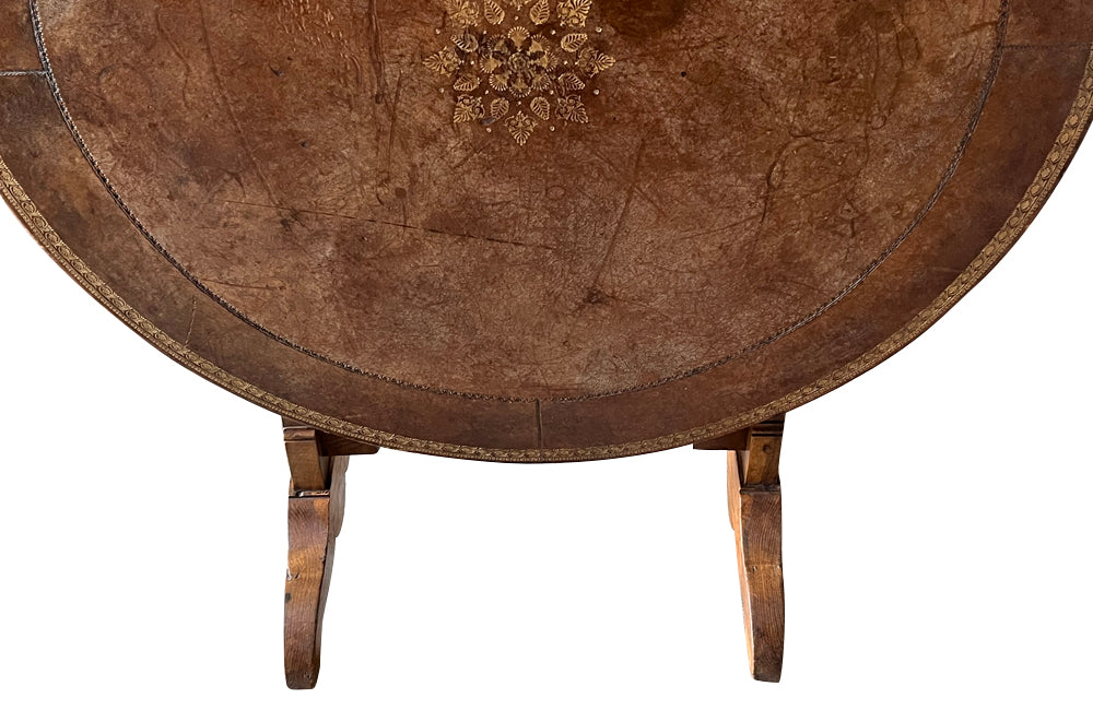 French,19th century, vineyard table with nicely worn embossed leather top .