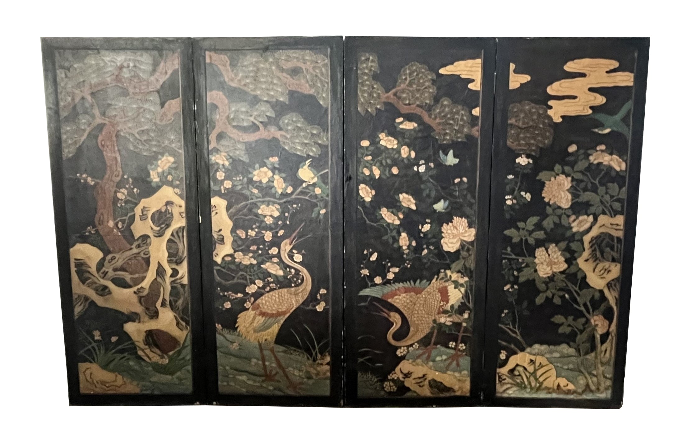 Beautiful, Japanese four panelled, screen. Ink on paper on wood.