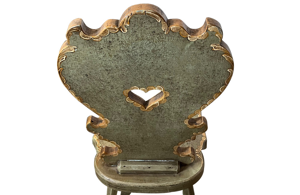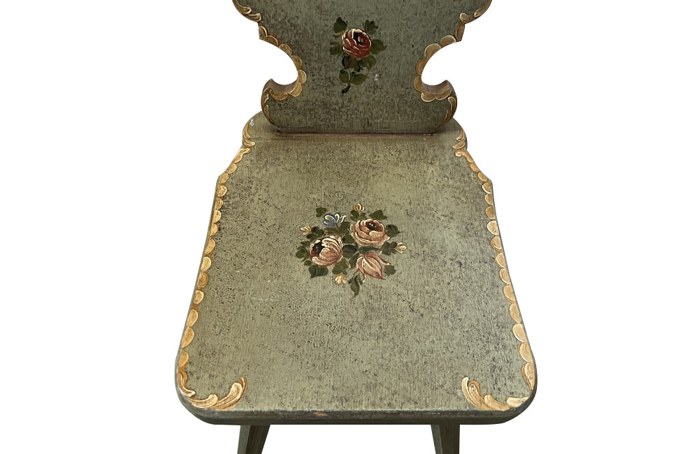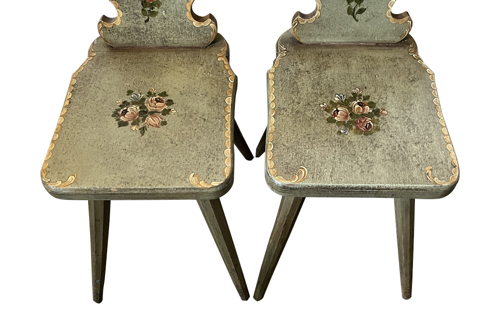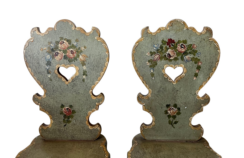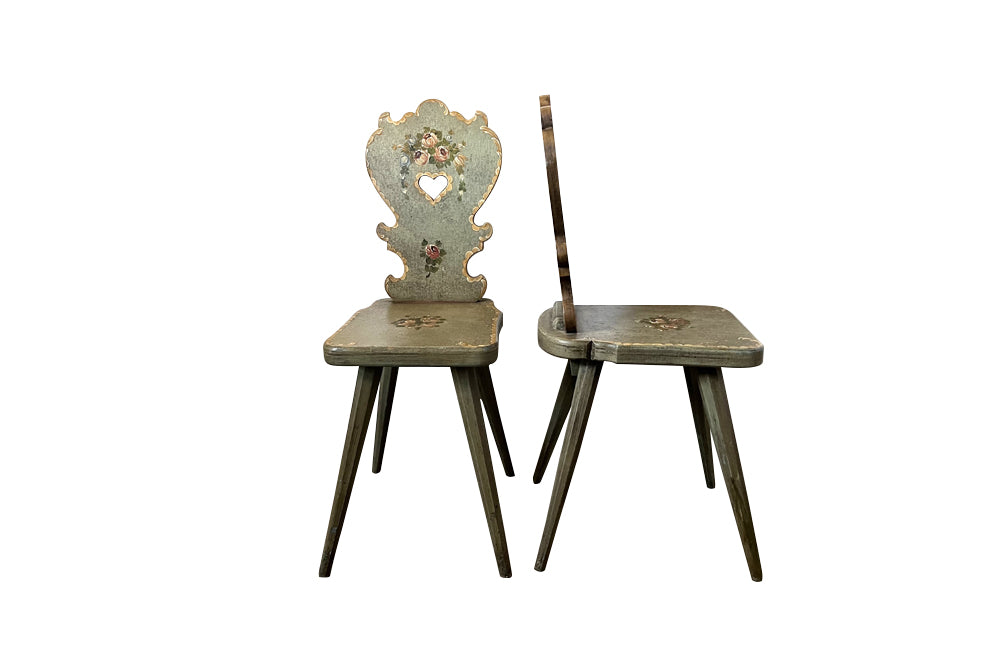 Pair of very, pretty painted Alsacian side chairs. With painted floral decoration to the seats and backs. Each seat back has a cut out heart.