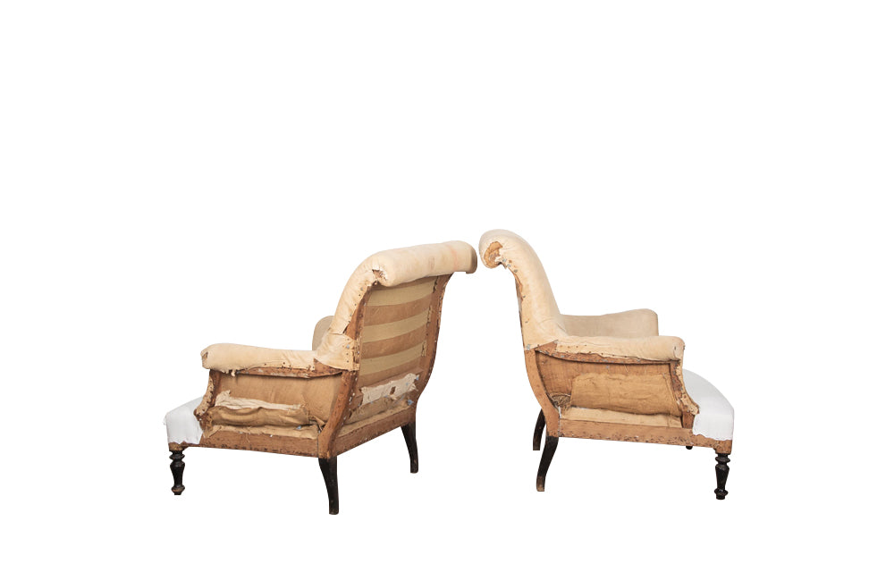 Pair of elegant strIpped French, 19th century, country house armchairs with scrolled backs. Ebonised turned legs. For recovering