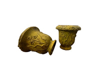 Pair of charming small cast iron urns decorated with daisies and leaves. They date to the early 1900's and have later cheery yellow paint.