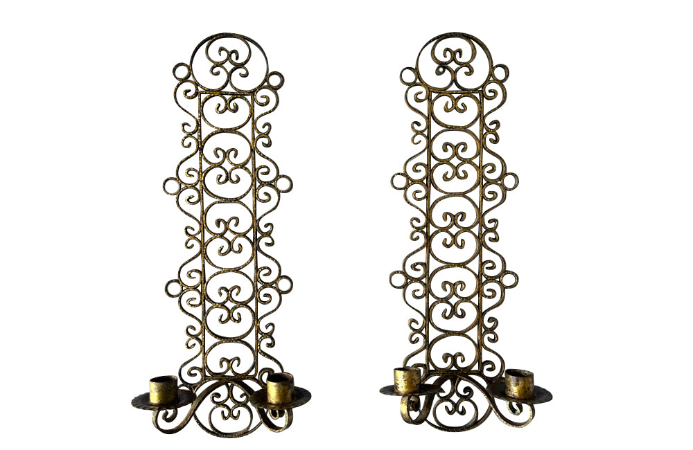Pair of mid 20th Century Spanish gilt scroll work iron wall sconces.