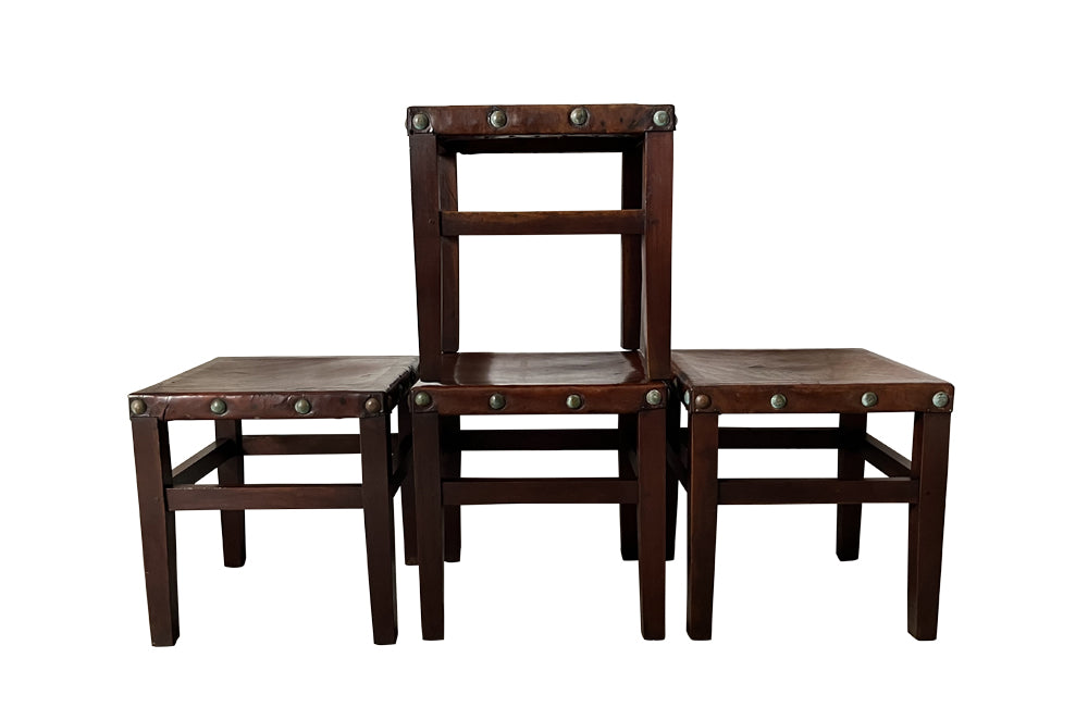 Set of four 20th Century Spanish stools with lovely original cowhide and large studding.