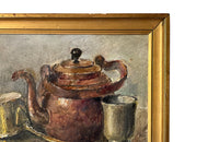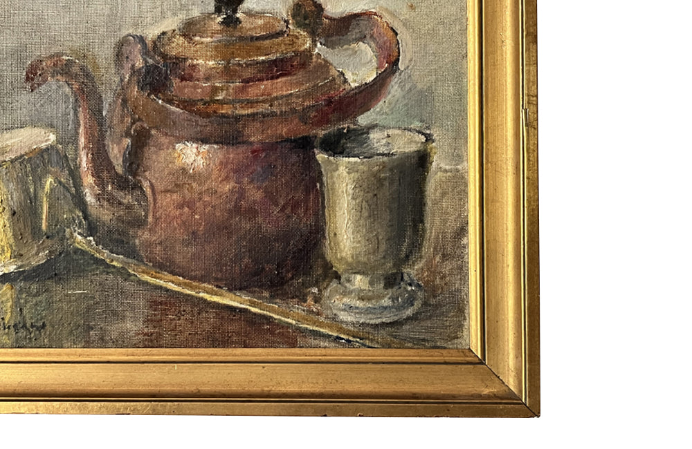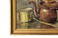 Late 19th Century French giltwood framed kitchen still life painting of a copper kettle with a lidded brass long-handled saucepan and beaker.