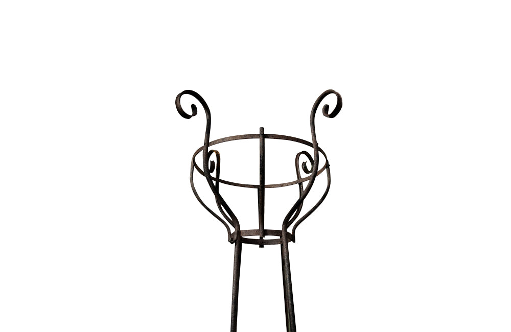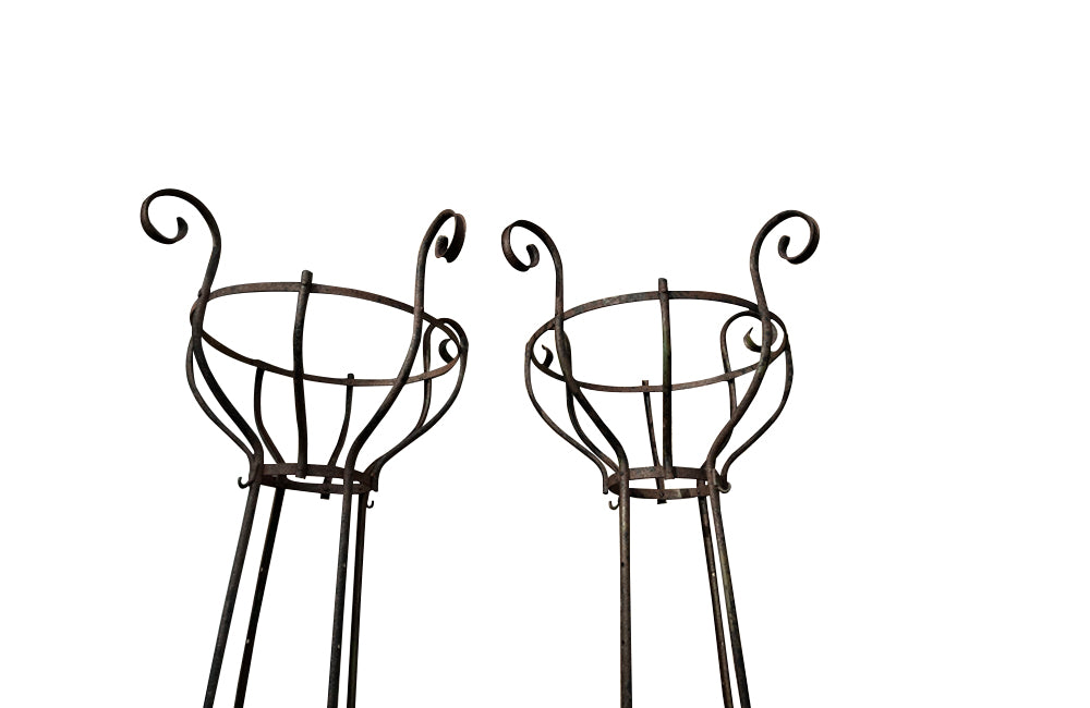 A fabulous pair of French tall iron plant supports. The each terminate in an upper decoratively curved basket shaped jardiniere holder and two hooks for hanging baskets.