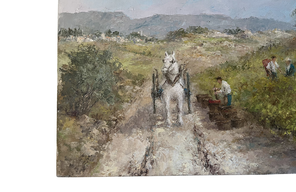 Grape pickers are hard at work while their harvest baskets are being collected by horse and cart. The blue skies and light of the south of France are beautifully captured in this evocative scene.