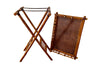 The stylish table top has a raised gallery to three sides and is ormented with bone roundels. It sits on a separate matching folding X-stand.