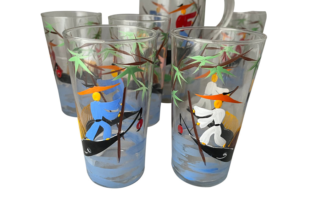 Fabulous, vintage, drink service comprising a pitcher and six tall glasses. All decorated with a chinoiserie theme of figures rowing sampans through waterlilies under overhanging bamboo .
