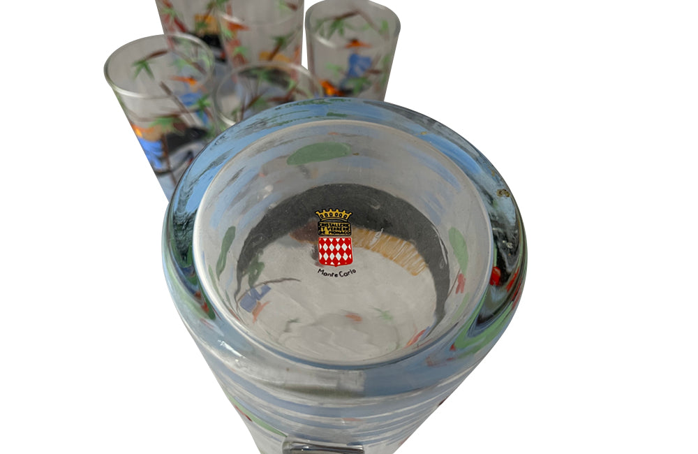This charmingly decorated lemonade set dates to the mid 20th century. In pristine condition. Made by the famous glass manufacturer Cristallerie et Verrere de Monaco, Monte Carlo.