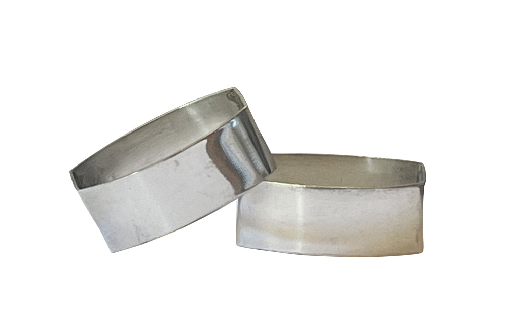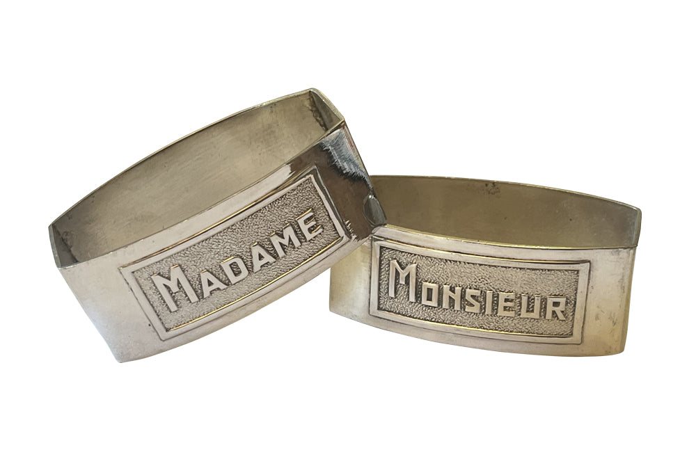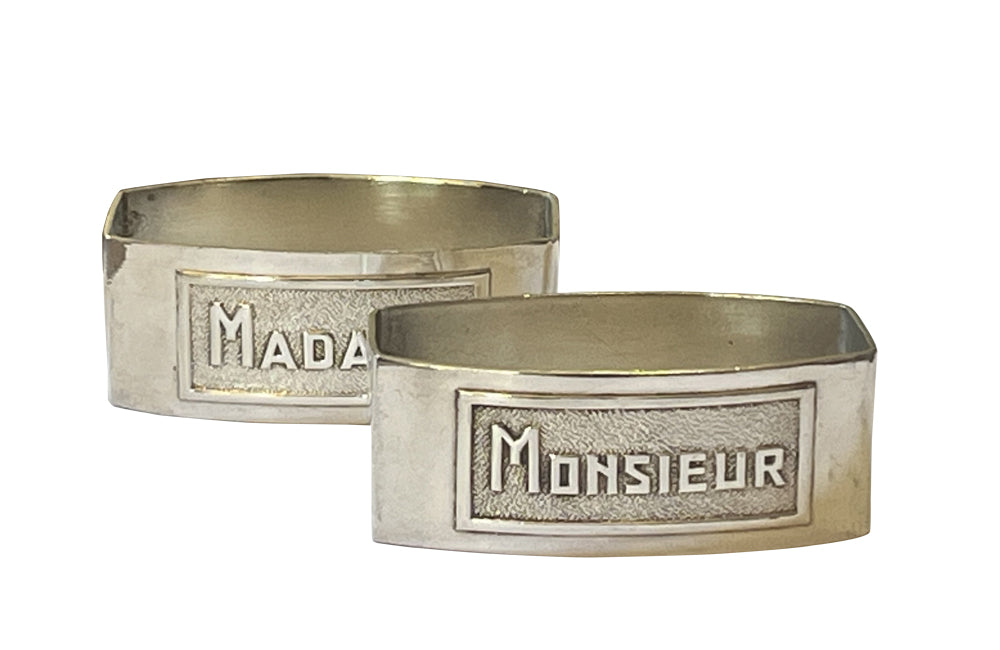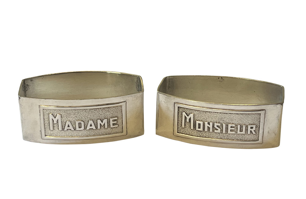 Pair of stylish, silver plate, Mr & Mrs, napkin holders from the Art Deco period. Both decorated with script, one Madame, the other Monsieur.