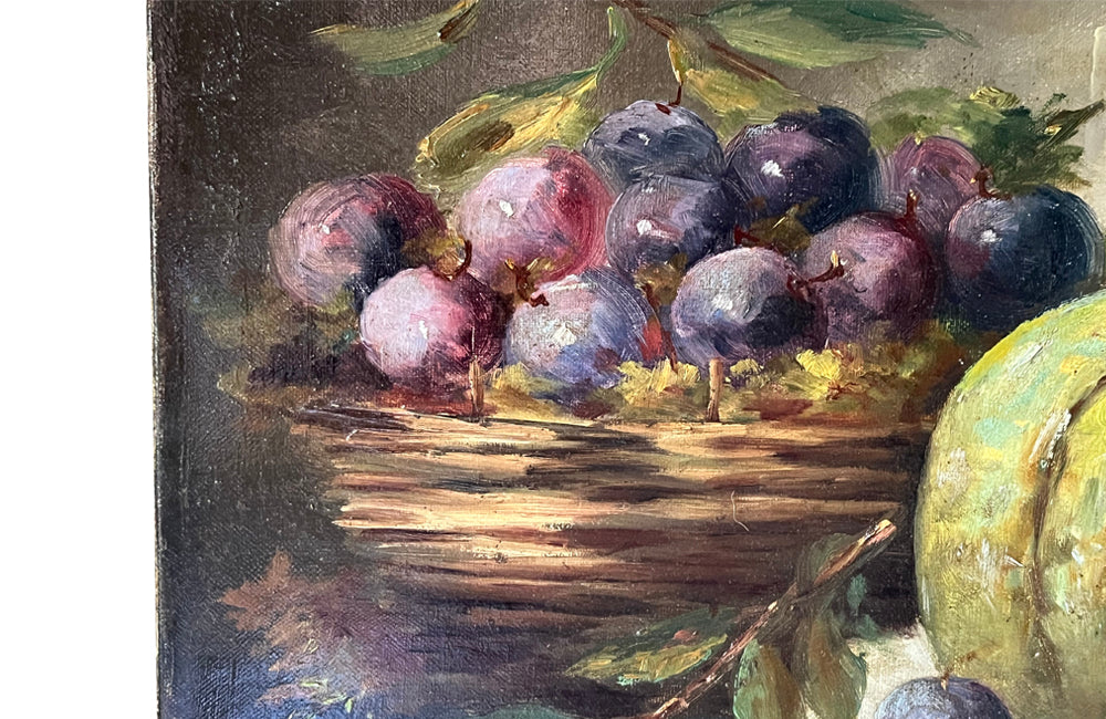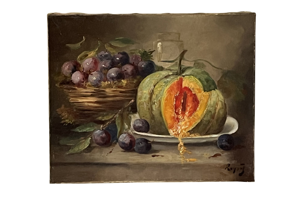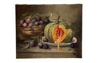 SIGNED STILL LIFE PAINTING OF PLUMS & MELON