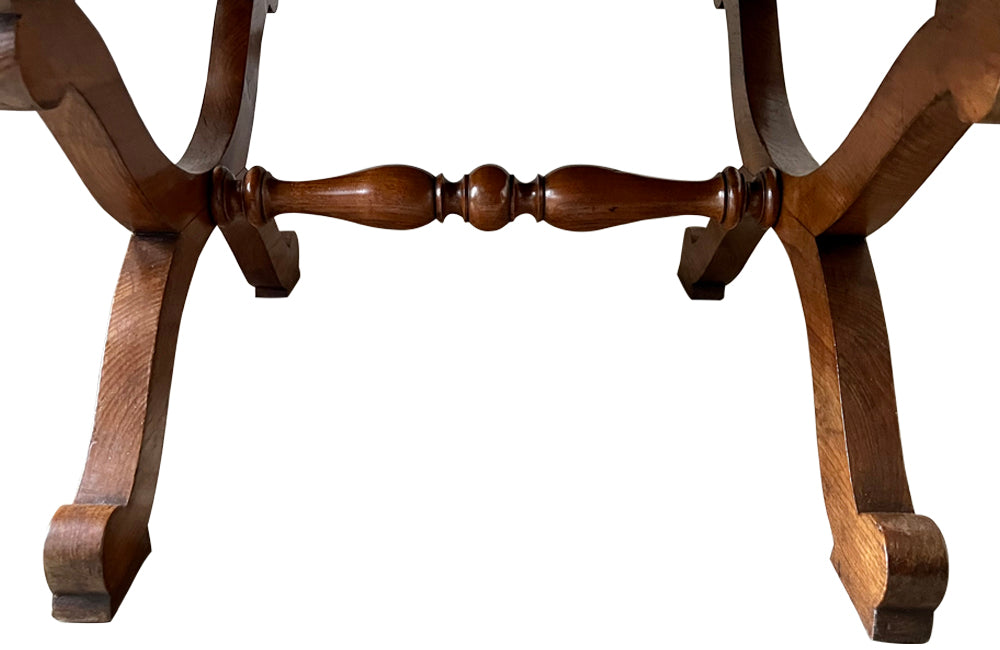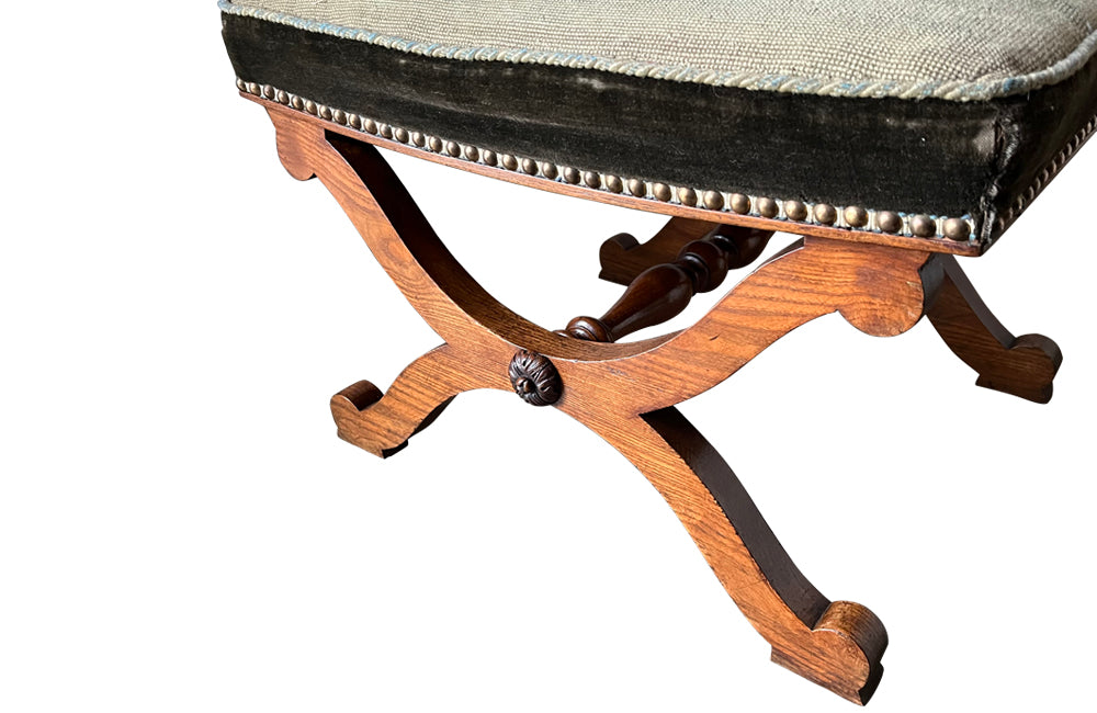 Oak x-frame stool in the Neo-Classical style with spindle stretcher. This lovely stool retains its charming tapestry depicting a Caribbean female figure. 19th century